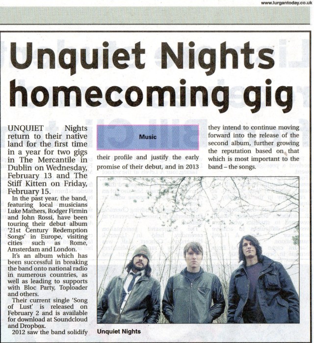 UNQUIET Nights return to their native land for the first time in a year for two gigs in The Mercantile in Dublin on Wednesday, February 13 and The Stiff Kitten in Belfast on Friday February 15th.