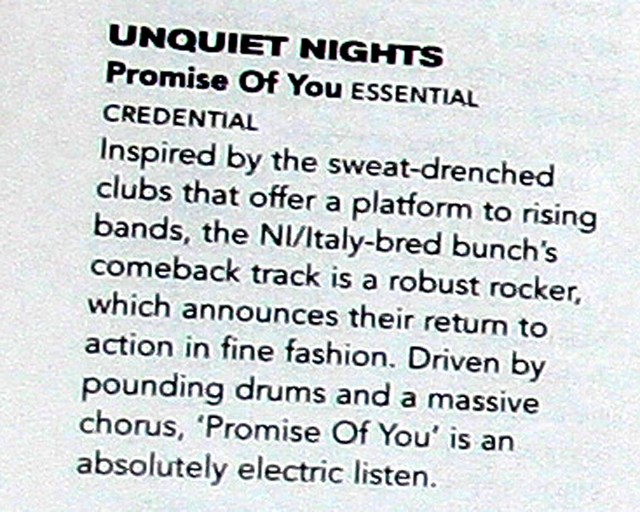 “…Inspired by the sweat-drenched clubs that offer a platform to rising bands, the NI/Italy-bred bunch’s comeback track is a robust rocker, which announces their return to action in fine fashion. Driven by pounding drums and a massive chorus, “Promise of You” is an absolutely electric listen….”