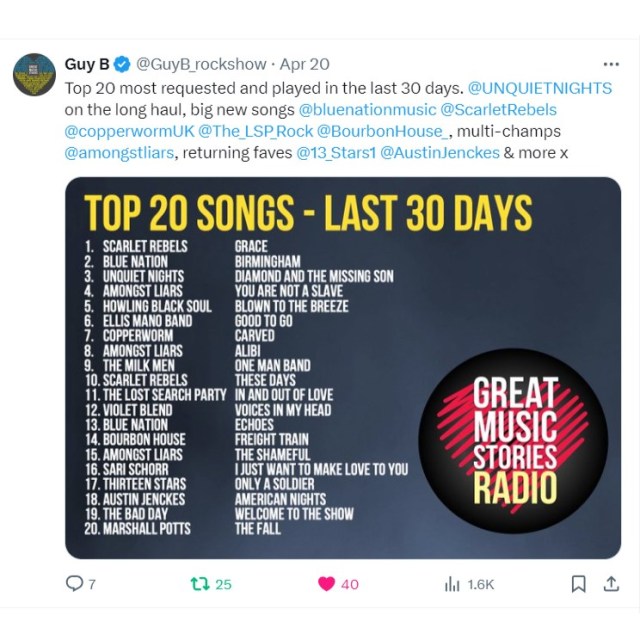 Really pleased to see that “Diamond and the Missing Son” is No.3 on the Top 20 most played and requested songs on Great Music Stories. Thanks to everyone who have been requesting us, and to Guy for running a great show. Loads of those songs on there are genuinely great, so it’s great to be in there too amongst them.