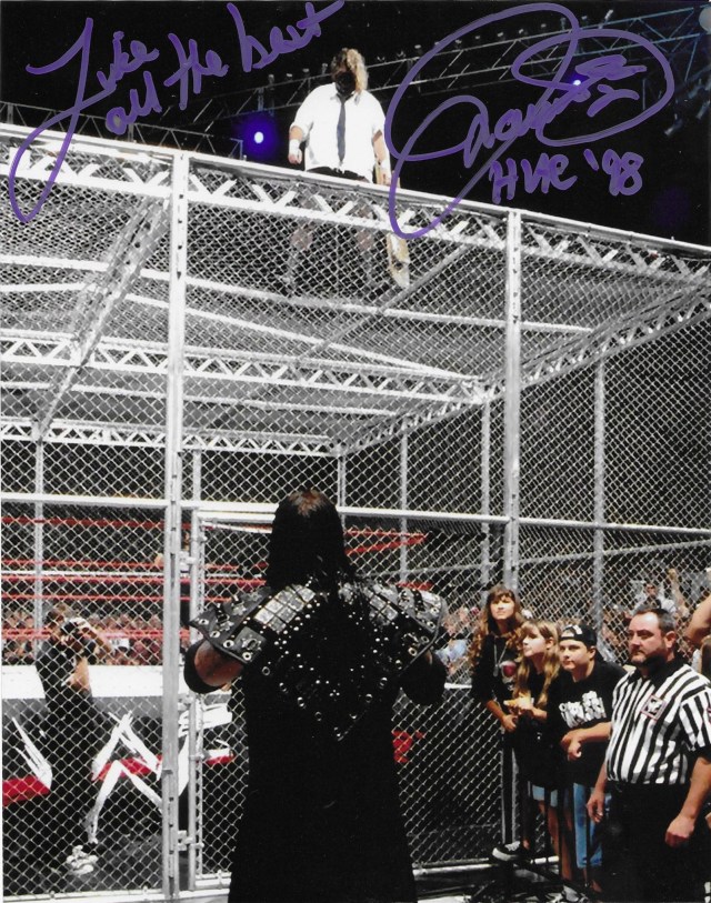 Met Mick Foley today. I mean Mankind, or Cactus Jack, or Dude Love. They’re four of the nicest people I’ve ever met. Here’s a Hell in a Cell 1998 print Mick gave us.