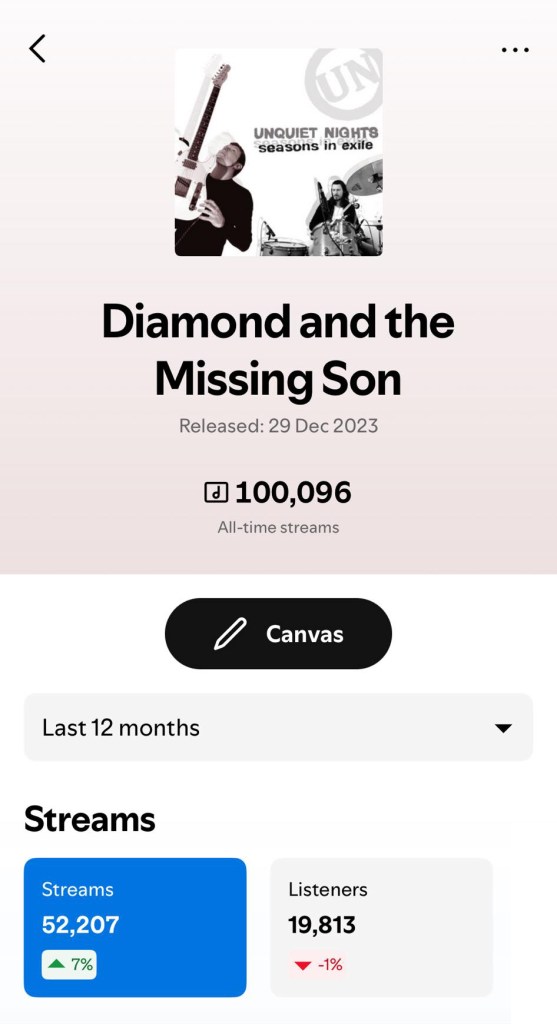 Thanks to everyone who has helped “Diamond & The Missing Son” become our fastest ever song to pass 100,000 Spotify streams. After more than 15 years of working on UN, it’s nice to see that people are liking our newer stuff too.
