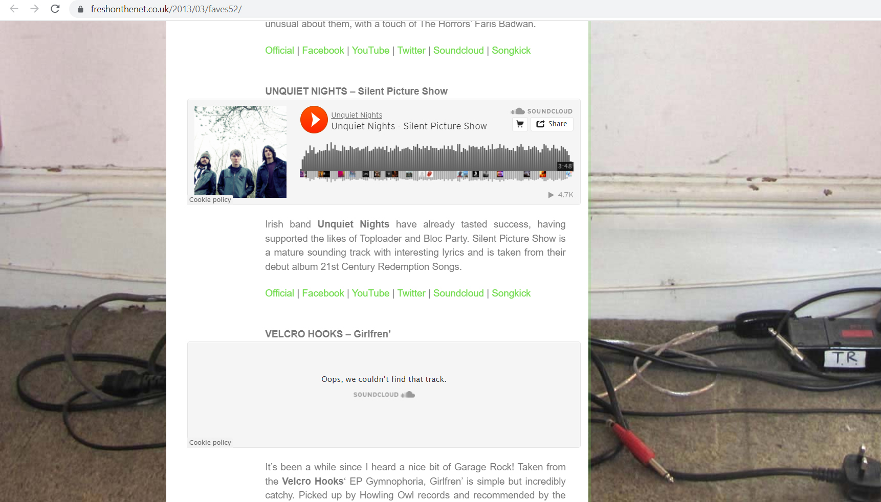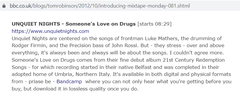 “..Someone’s Love on Drugs comes from their fine debut album 21st Century Redemption Songs – for which recording started in their native Belfast and was completed in their adopted home of Umbria, Northern Italy. They stress – over and above everything, it’s always been and always will be about the songs. I couldn’t agree more.…” (link) (screen)