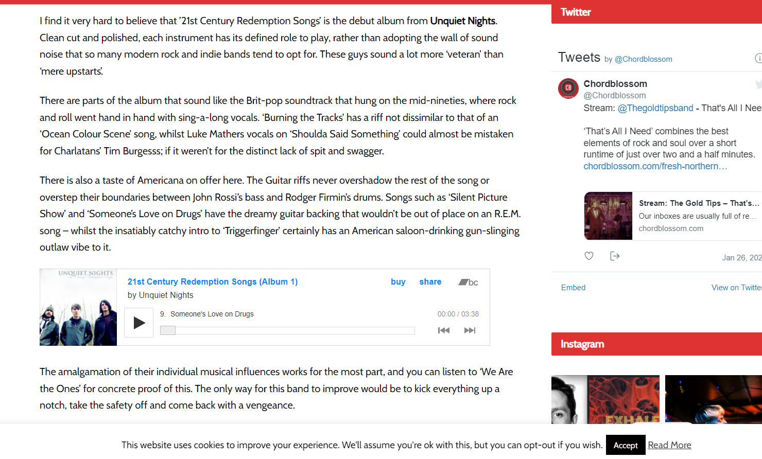“A really powerful track. It’s a great example of radio-friendly rock and I think Unquiet Nights are set for big things based on the strength of this song.”